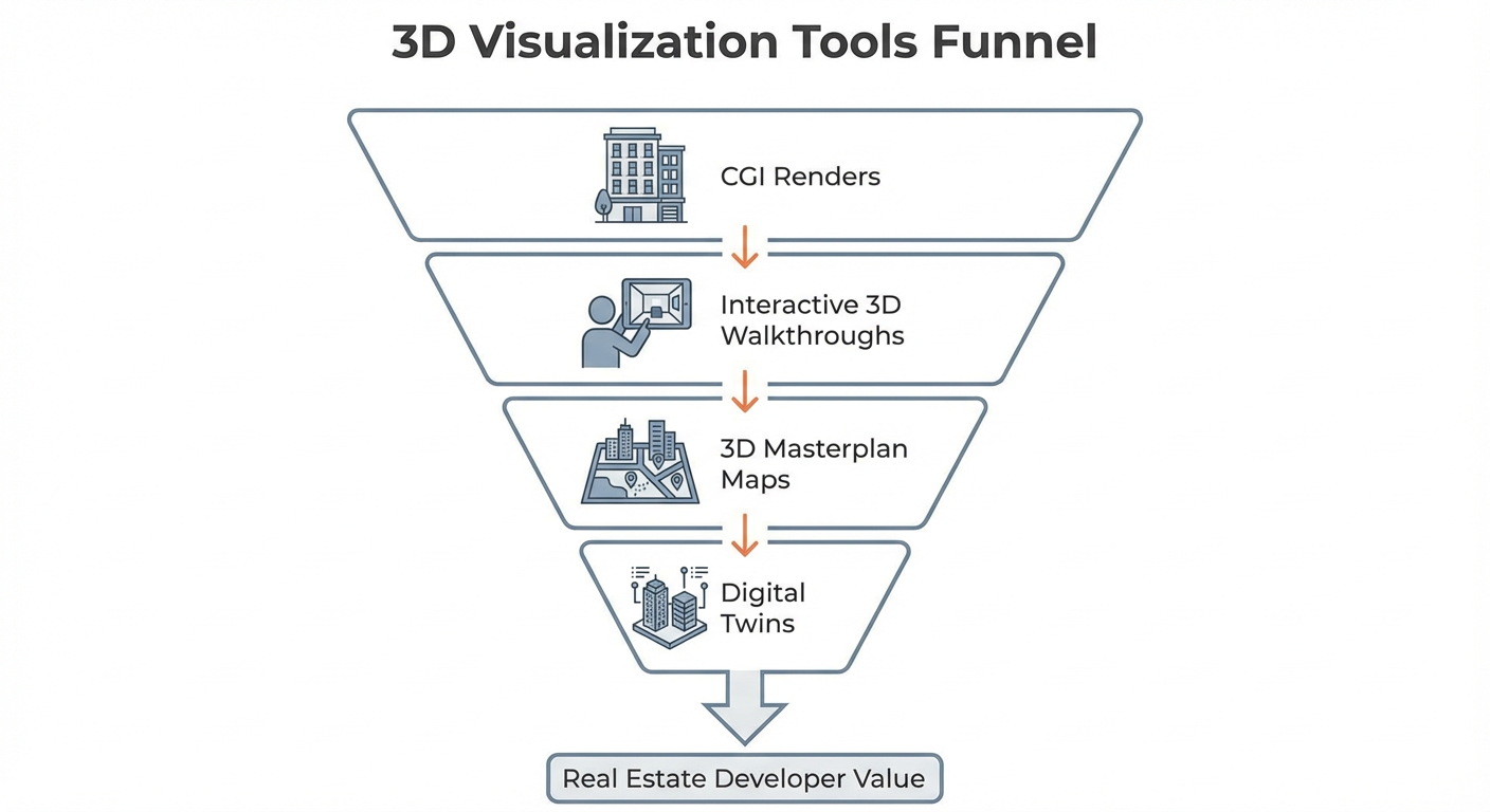 "3D" is a broad term. For real estate developers and marketing teams, it usually covers four layers: